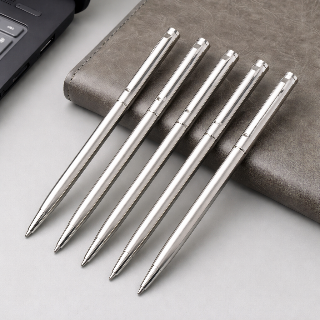 Kit com 5 canetas esferograficas em aco inox com design elegante e acabamento premium. Ideal para quem busca uma escrita suave, precisa e com estilo profissional no dia a dia.